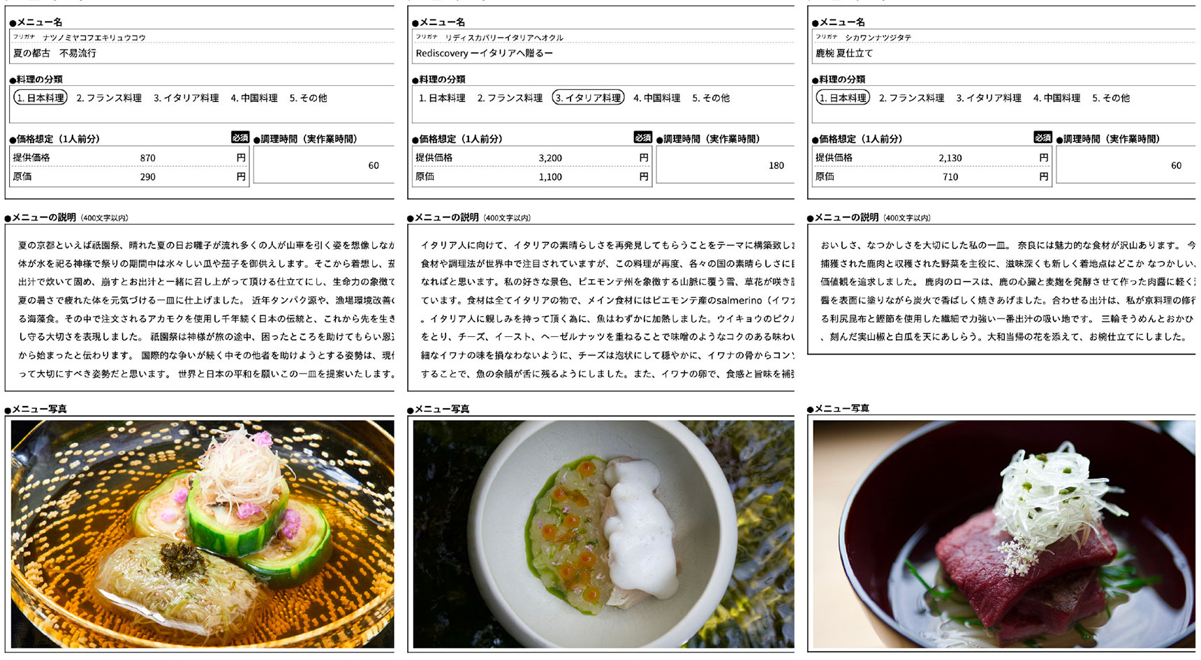 応募テーマ「日本から世界へ〜EARTH FOODS 25」の作文とメニューを提案。料理人としてのビジョン、メニューの考案力・創造力を問う。