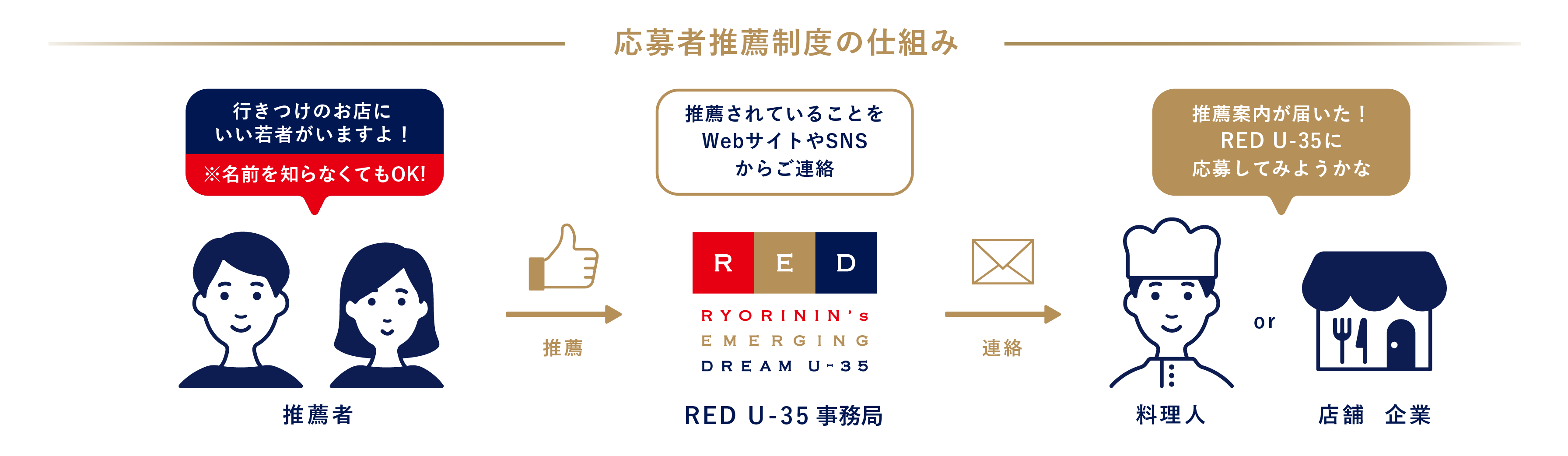 行きつけのお店・お知り合いのお店の料理人、注目している出張料理人・料理研究家・食クリエイターなど…「この料理人はスゴイ!」と思う若手料理人がいましたら、ぜひその方をRED U-35事務局まで推薦してください。